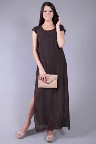 Стильное, скомбинированное из разных тканей платье с отрезным, оригинально оформленным лифом. Глубокие боковые разрезы до середины бедра. Короткий рукав-полуреглан. Круглый вырез горловины с отделкой кантом.
